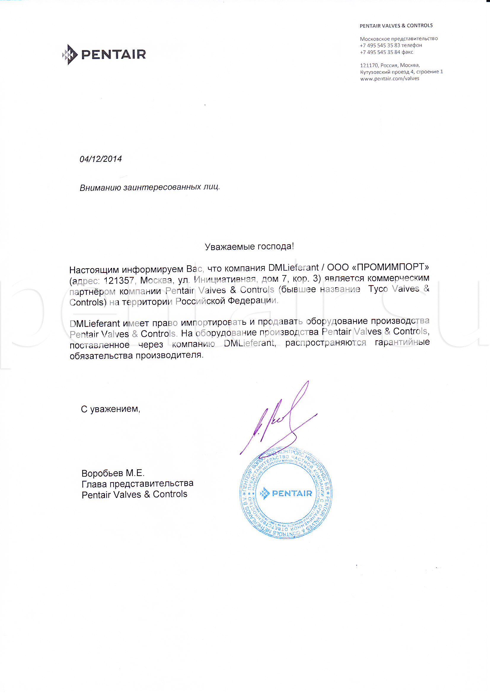 Компания DMlieferant является официальным партнёром корпорации Pentair Inc. на территории Российской Федерации и СНГ. DMLieferant самостоятельно импортирует оборудование производства корпорации Pentair Inc. напрямую с европейских заводов.